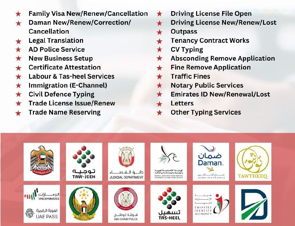 الهجرة، والخدمات المدنية تأشيرة عائلية جديد / تجديد / الغاء ضمان جديد / تجديد / تصحيح / الغاء (عادة ما يتعلق "ضمان" بالتأمين الصحي في أبوظبي) الهجرة (القناة الالكترونية) طباعة الدفاع المدني تصديق الشهادات ترجمة قانونية خدمة شرطة أبو ظبي خدمات كاتب العدل هوية الامارات جديد / تجديد / مفقود تصريح خروج (أوتباس) رسائل خدمات الأعمال والعمل تأسيس أعمال جديدة اصدار / تجديد الرخصة أبوظبي