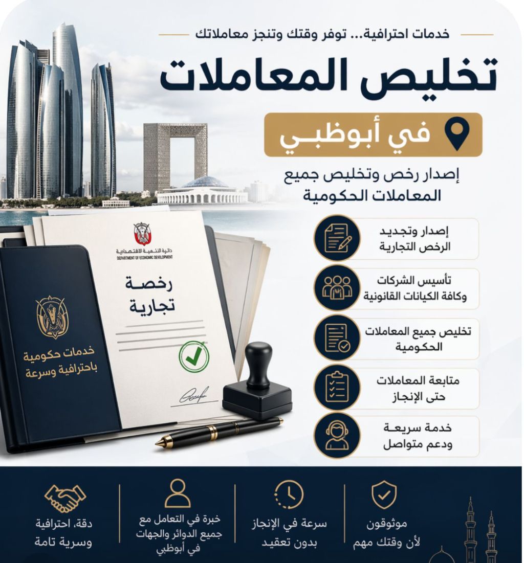 نقدم لكم خدمات متكاملة لمتابعة وانجاز جميع معاملاتكم الحكومية بكل سهولة وراحة اصدار وتجديد الرخص التجارية في أبوظبي اصدار الاقامات بكافة أنواعها متابعة معاملات الهجرة والعمل تخليص جميع المعاملات الحكومية بسرعة وكفاءة استشارات وخدمات مخصصة حسب احتياجك فريقنا متخصص بخبرة عالية لانجاز معاملاتك بأقل وقت وجهد، مع متابعة دقيقة حتى اتمام الخدمة