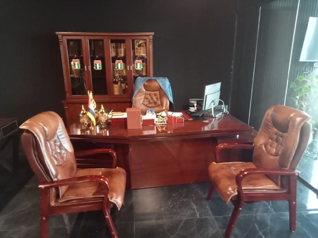 مكتبا فاخرا يضم مكتبا من الخشب الداكن وكرسيا تنفيذيا من الجلد بالاضافة الى كرسيين آخرين للضيوف خلف المكتب، توجد خزانة عرض زجاجية تحتوي على زجاجات ومقتنيات أخرى