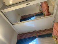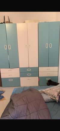 خزانة مع مراية مع 7 أرفف 200 وخزانة لونه أزرق وأبيض ما أدراج ورفوف 150 سرير مع فرشة 150