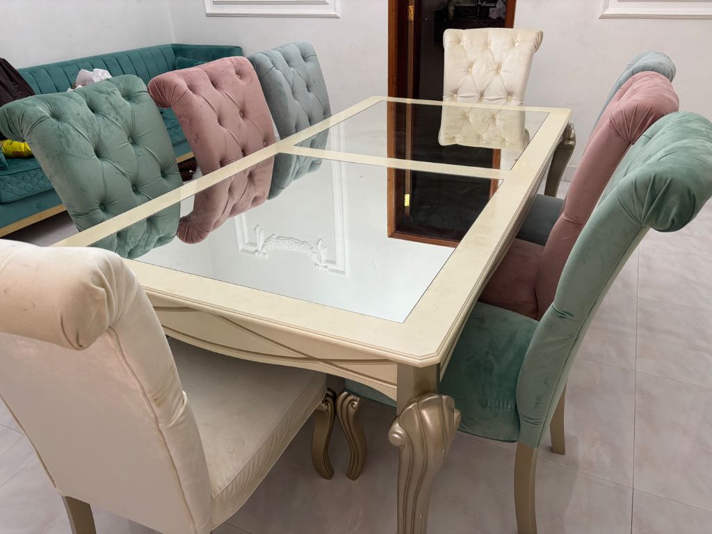 طاولة طعام ب 8 كراسي مخمليه ومراية على الطاولة