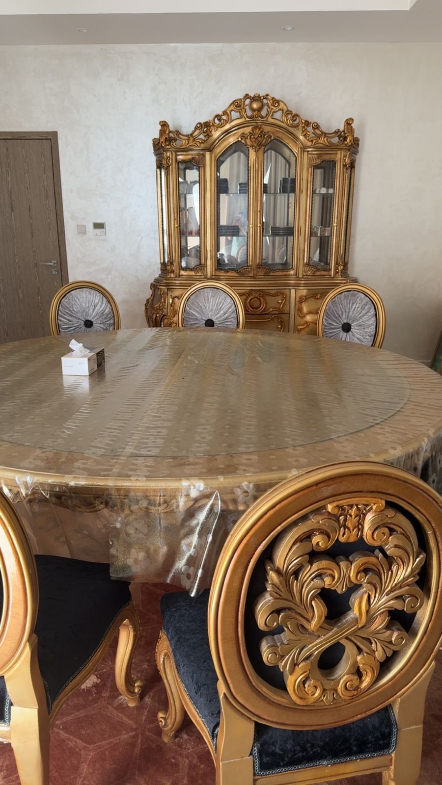 طاولة سفره مع كراسي عدد 12 مفصلين تفصيل بجودة عالية وبخشب ممتاز ولم يستعمل ابداً