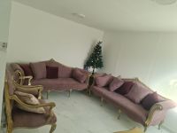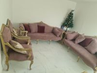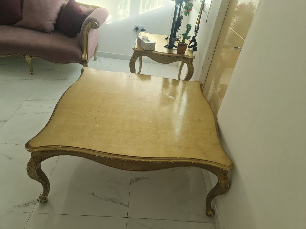 طقم كنب خشب زان مؤلف من قطعتين كبيرتين مع قطعتين صغيرتين وثلاث طاولات طاولة كبيرة وطاولتين صغيرتين مطلوب 1300 درهم وقابل للتفاوض بداعي السفر