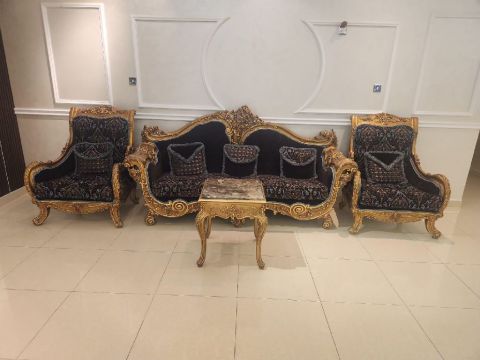 For sale, high - quality, elegant Egyptian beech sofas consisting of one large sofa for three people and four single sofas, with two small wooden side tables with marble and one large wooden table with glass. They were purchased for 20000 dirhams and I would like to sell them for 3000 dirhams. To contact