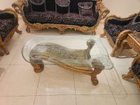 For sale, high - quality, elegant Egyptian beech sofas consisting of one large sofa for three people and four single sofas, with two small wooden side tables with marble and one large wooden table with glass. They were purchased for 20000 dirhams and I would like to sell them for 3000 dirhams. To contact