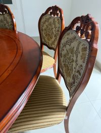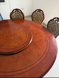 For sale Luxury Dining Set - 7 chairs + round dining table - Made of genuine Egyptian beech wood with high quality finishing - Purchased about 1.5 years ago - Excellent condition - Table includes a Lazy Susan (rotating tray) in the center Price AED1000 only Delivery to be arranged by the buyer (Location Abu Dhabi) Note Original price of the table was around AED4000