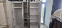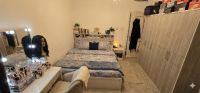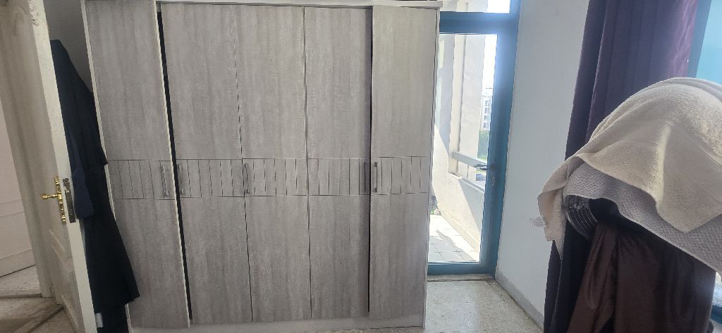 Complete bedroom set for sale. Includes a 180*200 queen bed with mattress, 5 - door wardrobe (207*191) dresser with mirror, and two bedside tables. The bed features a built - in electric outlet and USB port. Final price AED1500. Available and ready for immediate pickup