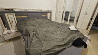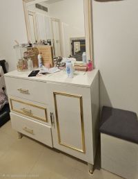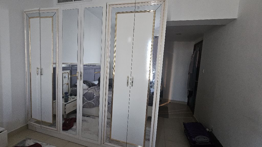 Very beautiful kingbedroom set with medium firm mattress very comfortable the set contains 1. king bed 2. mattress 3. big closet 4. small closet 5. mirror drawer 5. seating 6. mirror 7. mattress all for AED1599