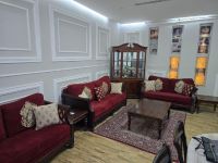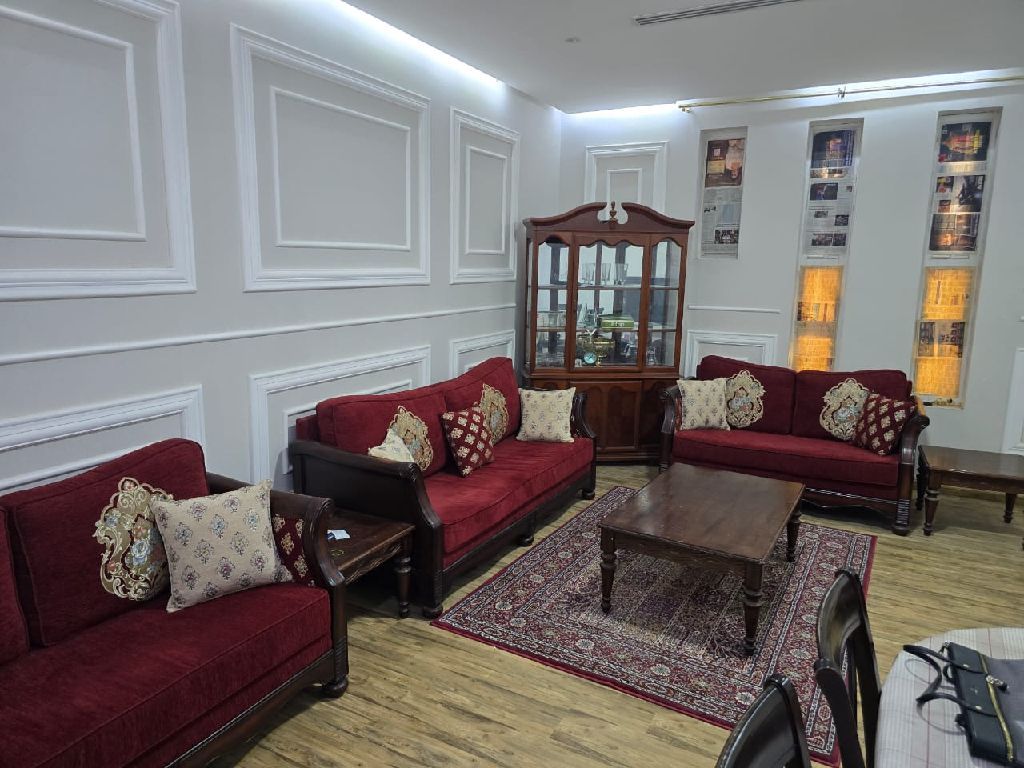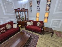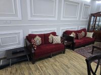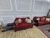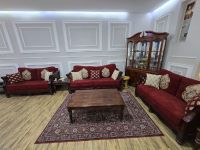 Premium Quality Solid Wood 7 Seater Sofa Set with Center Table, 3 Coffee Tables and a Turkish Carpet. Recently Upholstered with new covers and foam. Owner leaving the country. Located in Shakhbout City