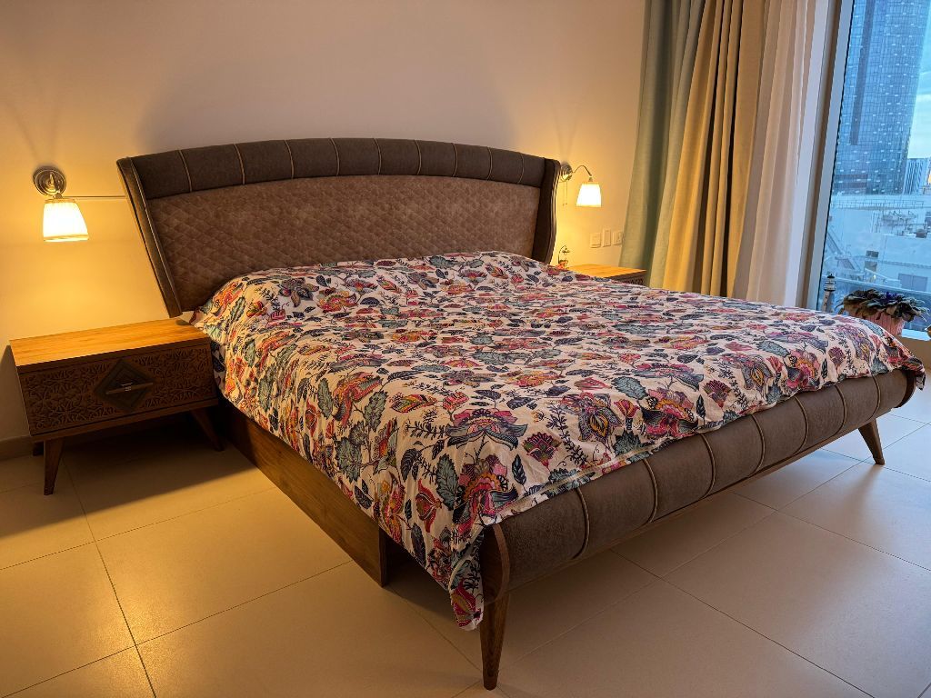 Bed for sale with 2 nightstands, mattress and lighting - price AED800 - Abu Dhabi - Al Reem Island