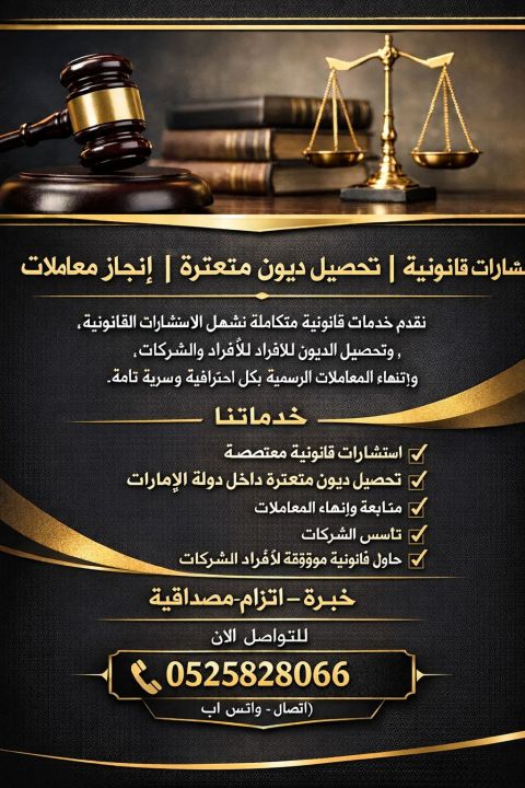 نقدم خدمات المحاكم والاستشارات وقيد الدعاوي أينما كنت وقت ما شئت من خلال خدمة واتساب VIP يمكنك التواصل معنا وانجاز جميع معاملاتك مع توفير غرامات التأخير تحصيل الديون داخل دولة الامارات تحصيل الديون والشيكات العمالة منزلية والعمالة المساعدة الضمان الصحي للأفراد وللعمالة المساعدة اصدار / تجديد الهوية والإقامة الدائرة الاقتصادية العمال وتأسيس الشركات