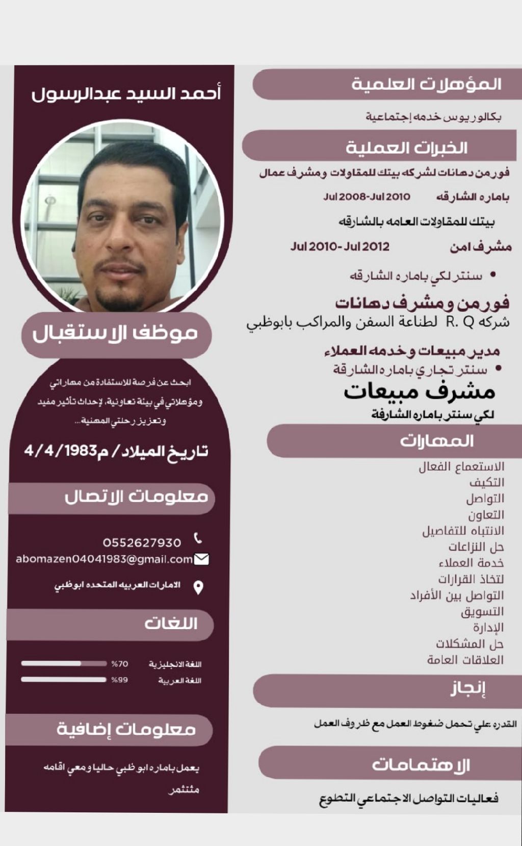 مشرف أمن في مول تجاري في الشارقة وفورمان دهانات ومشرف عمال في أبوظبي ومعي إقامة مثتثمر في أبوظبي