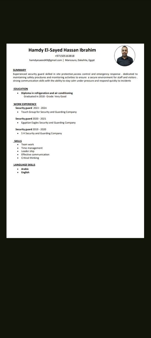 اسمي حمدي السيد حسن متواجد في الامارات عندي 26 سنة بدور على شغل أمن
