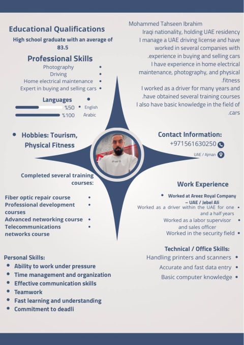 محمد أشرف من مصر ابحث عن فرصة عمل متواجد حاليا في عجمان كنت اعمل سابقا في القوات المسلحه المصريه لمدة ثمانيه أعوام