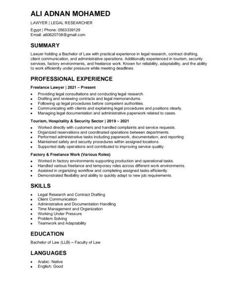 الاسم عمر محمد. العمر 26 عام - الجنسية مصري. المؤهل العلمي شهادة التعليم الثانوي التجاري. خبرة سابقة سنتان في الجيش لدي خبرة في مجال الأمن من خلال العمل في شركة "إيجلز جروب" لمدة عام. امتلك مهارات التواصل الانساني مع الآخرين والقدرة على التعامل مع المواقف الصعبة بمرونة. كما انني أجيد التعامل مع الحالات