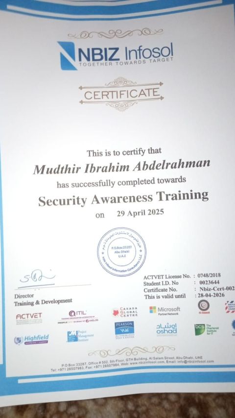 An Egyptian resident in Abu Dhabi, age 35, holds an international protection certificate from the United Nations and the African Union, and has completed the International Counter - Terrorism course and the Egyptian Thunderbolt Forces course
