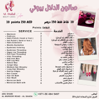 صالون الدلال بيوتي أبوظبي دللي نفسك بجلسة جمال واسترخاء مثل الأميرات عرض النقاط المميز 10 نقاط فقط ب 150 درهم تختاري منها الخدمات اللي تحبينها منيكير بديكير، تركيب رموش، حمام مغربي، عناية شعر، واكس والمزيد صبغات الشعر ابتداء من 150 درهم الوان جذابة ولمسة احترافية تخلي شعرك يلمع بالجمال واستمتعي ب حمام كريم مكاديميا للشعر ب 80 درهم متوفر عروض على الحنة