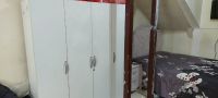 For urgent sale in Abu Dhabi Used furniture including a washing machine, electric stove, refrigerator, bed, and 3 - door dresser