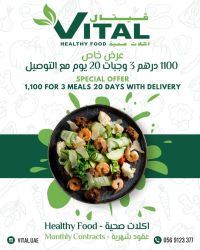 فيتال للاكلات الصحية اكلات صحية - عقود شهرية صحي ولذيذ وعلى قد الايد VITAL HEALTHY FOOO Healthy Food - monthly Plans Loose weight خسارة وزن Body building زيادة وزن Life style ثبات للوزن Keto كيتوا Gulten free جلوتين مجاني Vegeterian نباتي Free Delivery - Abu Dhabi عرض خاص 1100 درهم ثلاث وجبات 20 يوم شامل التوصيل والضريبة. Special offer AED1100 3 meals 20 days inclu