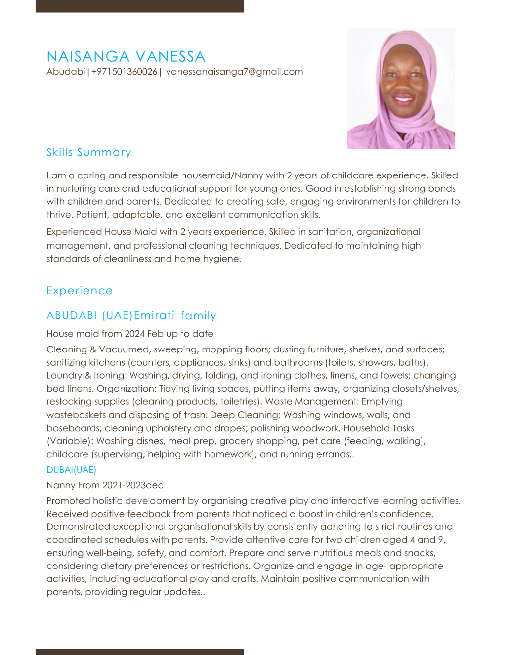 I am a caring and responsible NANNY/ Housemaid with over 2 years of experience working with families in the UAE. I am dedicated to providing loving childcare while maintaining a clean, organized, and comfortable home. I am experienced in childcare, feeding, basic cooking, homework support, play activities, and daily routines. I am patient, trustworthy, and good at building positive relationships