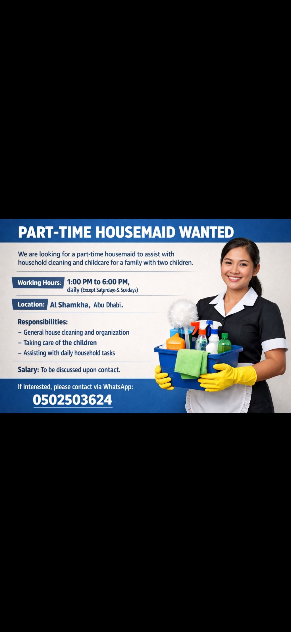 مطلوب عاملة منزلية للعمل من الساعة 1 ظهرا ولغاية 6 مساء بمنطقة الشامخة، عائلة مكونة من أربع أشخاص بينهم طفلين