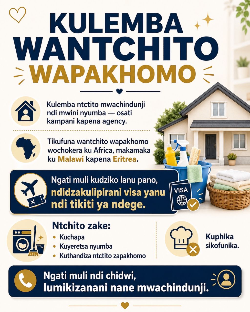 مطلوب عاملة منزلية من دولة ملاوي، للتنظيف والغسيل والمساعده في المنزل (الطبخ غير مطلوب) يفضل استقدامها من بلادها الأصل. العمل في أبوظبي منطقة الشامخة حي 14