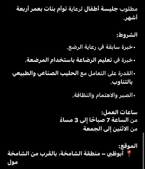 مطلوب جليسة اطفال لرعاية توأم بنات بعمر أربعة أشهر. الشروط خبرة سابقة في رعاية الرضع. خبرة في تعليم الرضاعة باستخدام الم رضعة. القدرة على التعامل مع الحليب الصناعي والطبيعي بالتناوب. الصبر والاهتمام والنظافة. ساعات العمل من الساعة 7 صباحا الى 3 مساء من الاثنين الى الجمعة لمن تجد في نفسها الكفاءة، يرجى التواصل. المنطقة أبوظبي الشامخة بالقرب من الشامخة مول