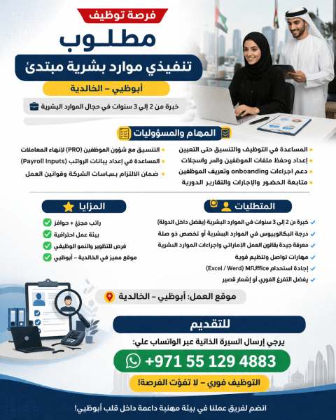 مطلوب موظف موارد بشرية (HR) خبرة قوية في التوظيف واختيار الكفاءات، مع قدرة عالية على إدارة قسم الموارد البشرية باحترافية وعلى أعلى مستوى للعمل في أبو ظبي