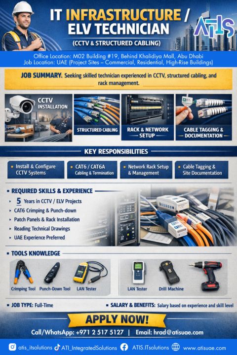 We’ re Hiring IT Infrastructure/ ELV Technician (CCTV & Structured Cabling) Seeking a skilled technician with 5 + years’ experience in CCTV, ELV, and structured cabling, including hands - on installation, maintenance, and reading technical drawings. Location in Abu Dhabi, UAE apply now or tag a qualified candidate