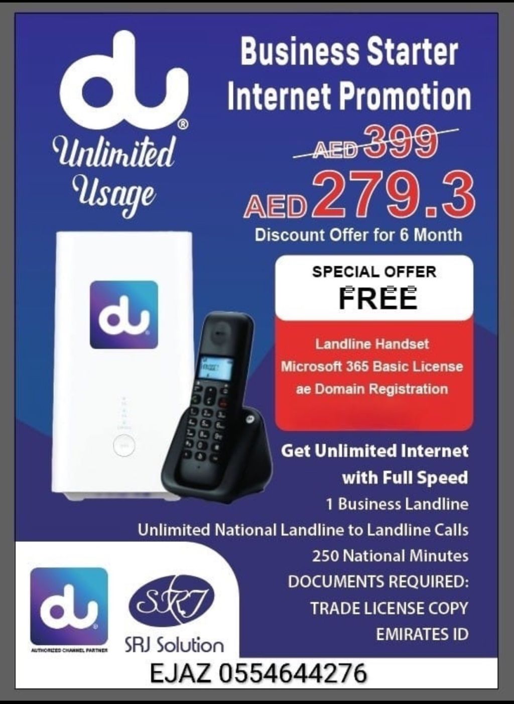 Business 5G Unlimited Internet Offer 1 Business Landline Number Unlimited Landline Calls 250 Mobile Minutes Free Landline Handset Microsoft 365 Included Free ae Domain 5G Ready Router Special Offer AED279 per month for first 6 months after that AED399 per month Existing landline number can be transferred to du For details contact Ejaz Ahmed SRJ Authorized Partner of du