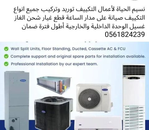 نسيم الحياة لأعمال التكييف توريد وتركيب جميع أنواع التكييف صيانة على مدار الساعة قطع غيار شحن الغاز غسيل الوحدة الداخلية والخارجية أطول فترة ضمان