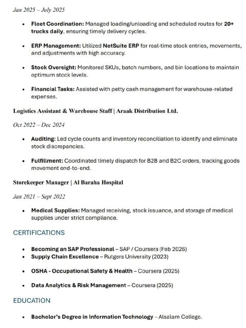 حضرة مدير التوظيف، أكتب اليكم لأعرب عن رغبتي في شغل وظيفة أمين المستودع. لدي خبرة واسعة في إدارة المخزون، واستلام البضائع، وتوزيعها، وترتيبها، واستخدام أنظمة تخطيط موارد المؤسسات (ERP) أنا شخص منظم، وجدير بالثقة، وقادر على العمل تحت الضغط بدقة وسرعة. أنا متواجد حاليا في دولة الامارات العربية المتحدة، ومستعد للانضمام الى العمل فورا. شكرا لكم على اهتمامكم. مع خالص التحيات، مجتبي جعفر