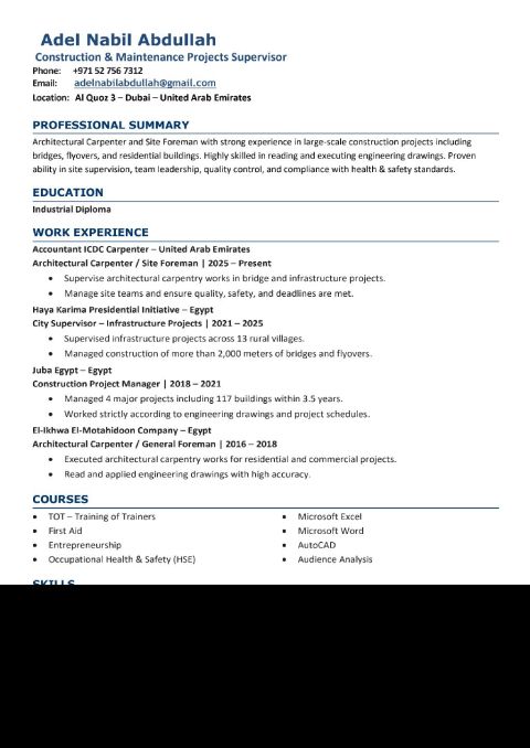 مشرف انشاءات وصيانة خبرة أكثر من 8 سنوات