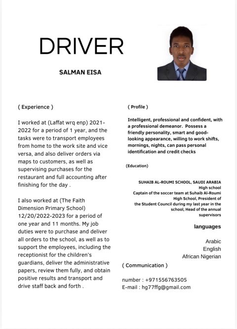 سائق خاص لدى رخصة قيادة اماراتية منذ 7 سنوات أثيوبي الجنسية مسلم الديانة أرغب في العمل لدى عائلة أو شركة مندوب توصيل طلبات