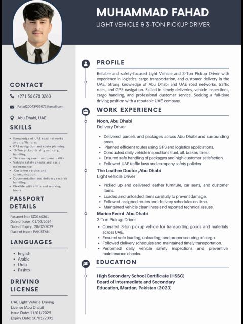 My name is Muhammad Fahad. I am from Pakistan, currently on a freelance visa in the UAE, and hold a light vehicle driving license. I am actively looking for driving job opportunities