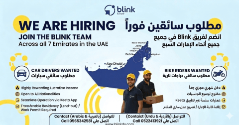 مطلوب سائقين (سيارات ودراجات نارية) لشركة Blink - دخل مجزي جدا انضم الى أسرع فريق توصيل في الامارات شركة Blink تطلب شركاء نجاح من جميع الجنسيات لزيادة أسطولها في كافة امارات الدولة. المميزات دخل شهري مجزي يعتمد على عدد الطلبات المكتملة. العمل يغطي جميع امارات الدولة السبع. نرحب بجميع الجنسيات. نظام تقني متطور عبر تطبيق Keeta. الشروط سيارة خاصة أو دراجة نارية إقامة سارية (قابلة للاعارة / Lend - out)