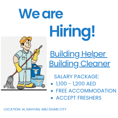 نحن نوظف منظف مباني ومساعد في منطقة النهيان، أبوظبي. الراتب 1400 + السكن. اذا كنت مهتما، يرجى ارسال سيرتك الذاتية الى