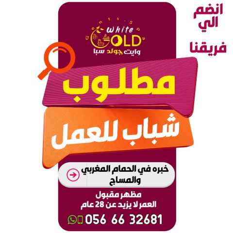 مطلوب شباب رياضيين للعمل في سبا للرجال - شارع هزاع بن زايد - أبوظبي - للعمل في التدليك والحمام المغربي والعمر لا يزيد عن 28 عام. الراتب بالنسبة بجانب التيبس فقط ولا يوجد سكن
