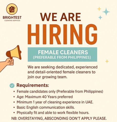 A cleaning company in Hamdan St Abu Dhabi are looking for cleaners who can join immediately with minimum 1 year experience in cleaning company before