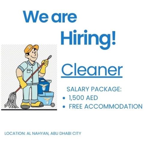 We are hiring for Cleaner in Al Nahyan, Abu Dhabi. Salary is 1500 + accommodation. If interested, please share your CV to Apply Now