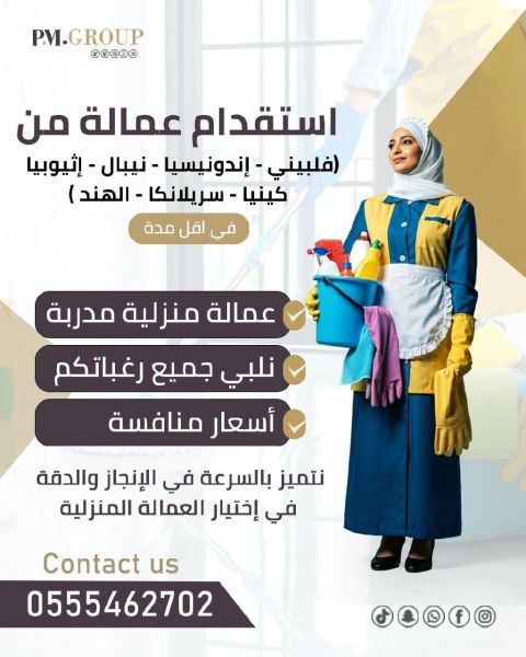 متوفر لدينا عمالة منزلية مدربه من جميع الجنسيات طباخات مربيات رعاية الاطفال وسائقات ورعاية كبار السن بأقل الأسعار مع ضمان سنتين وفقا لوزارة الموارد البشرية والتوطين