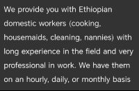 لدي عاملات منازل أثيوبيات، بعضهن ذوات خبرة وبعضهن بدون خبرة. جميعهن قادرات على الطبخ ورعاية الاطفال وتنظيف المنزل. للتواصل، يرجى مراسلتي عبر البريد الألكتروني على أو عبر واتساب على الرقم