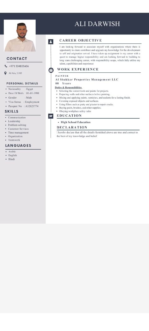 أنا مصري عندي صنايعي صبغ وفي المجال ثمان سنوات في دولة الامارات العين شركة مندنس