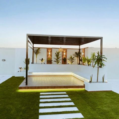 تنسيق الحديقة الخاصة لمنزل وزراعة الأشجار وشجرات الزينة وعمل شبكة الري الحديثة وتركيب الباسكو واضأه لحديقة وعقود صيانة شهريه للتواصل