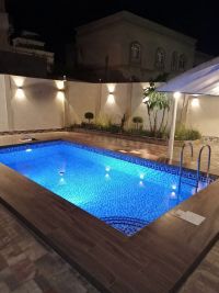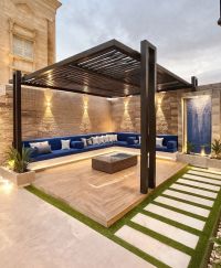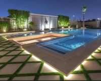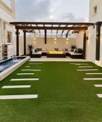 متخصصون في التصميم وتنسيق الحدائق المنزلية شلالات مسابح نوافير مظلة مودرن مع جلسة أحواض زراعة طبيعي عشب صناعي مع ممر مع اضاءة بديل خشب غرفة زجاجية مغلقة سواتر