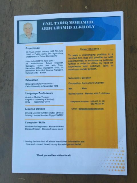 طارق محمد الخولي مصري العمر 69 متزوج مهندس زراعي تنسيق حدائق لدي اقامة في الامارات حتى مايو 2026 لدي رخصة قيادة اماراتية خبرة 23 عام في بلدية دبي قسم الحدائق 3 أعوام في جمهورية السودان لتنفيذ ملعب جولف اللغة الانجليزية جيد جدا لدي دراية باستخدام الكومبيوتر ولدي دورات في الصيانة الزراعية والجودة الشاملة وكيفية التعامل مع الآخرين والوقاية الزراعية مستعد لتقديم كافة مستندات اذا طلبت مني