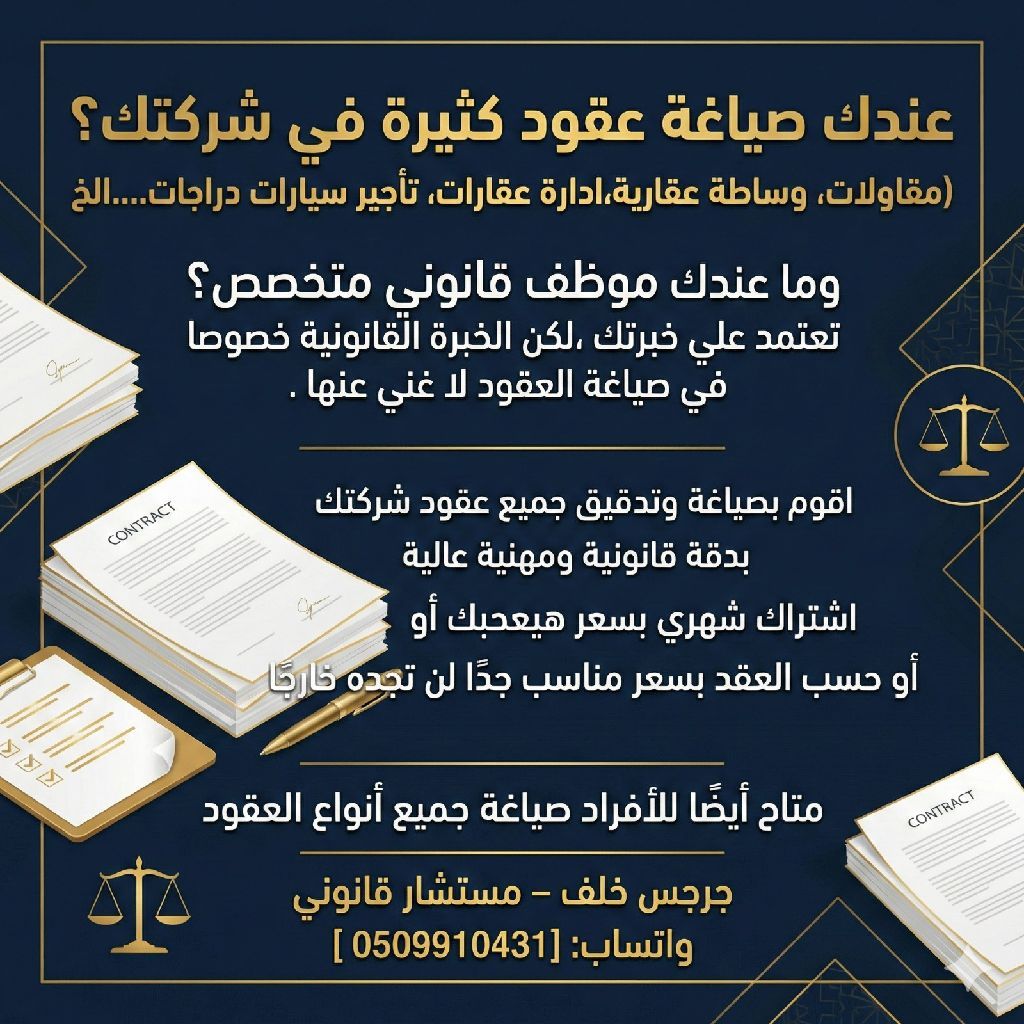 هل لدى شركتك عقود كثيرة وتحتاج صياغة أو تدقيق قانوني بدون تعيين موظف قانوني أقدم خدمة صياغة ومراجعة جميع أنواع العقود للشركات (مقاولات، عقارات، تأجير، توريد، شراكات) باشتراك شهري أو حسب العقد بسعر مناسب جدا. متاح أيضا للأفراد لجميع أنواع العقود. جرجس خلف - مستشار قانوني متخصص في صياغة جميع أنواع العقود المدنية والتجارية وعقود البيع والإيجار والشراكة وتأسيس الشركات، تواصل الآن قبل فوات الأوان