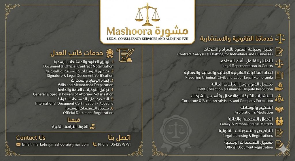 مكتب مشورة للاستشارات القانونية هل لديك مشكلة قانونية هل تبحث عن استشارة موثوقة وسريعة نحن في مكتب مشورة نقدم لك أفضل الحلول القانونية باحترافية عالية وخبرة متميزة في دولة الامارات خدماتنا الاستشارات القانونية صياغة ومراجعة كافة أنواع العقود صياغة المذكرات القانونية (جزائية - مدنية - عمالية) تحصيل الديون ومتابعة القضايا خدمات كاتب العدل لماذا تختارنا سرعة في الانجاز سرية تامة خبرة قوية في التعامل