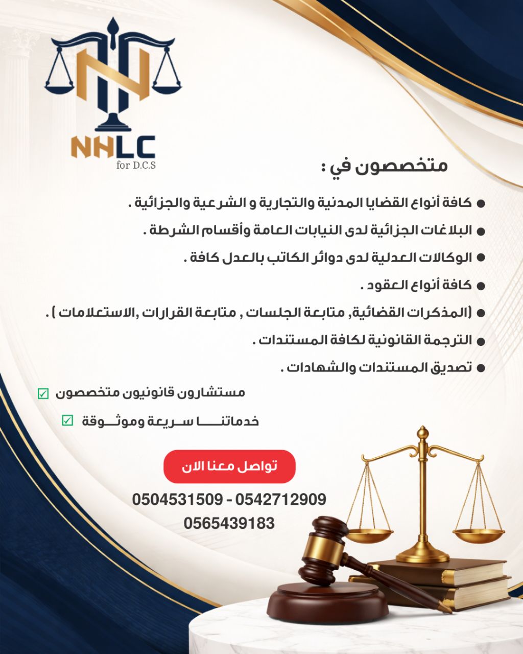 NHLC for DCS offers specialized legal services tailored to your business needs. Our team of highly experienced consultants possesses in - depth knowledge in handling various civil, criminal, commercial, and Sharia cases. Specializing in Civil, commercial, criminal, and Sharia cases Criminal reports filed with public prosecutors and police stations Notary public powers of attorney All types of contracts