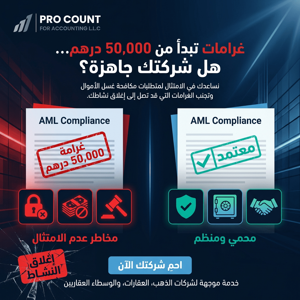 اذا كنت تعمل في قطاع الذهب والمجوهرات أو العقارات، فإن الامتثال لأنظمة مكافحة غسيل الأموال وتمويل الإرهاب (AML / CFT) لم يعد خيارا بل الزامي. عدم التسجيل في نظام goAML يعد مخالفة صريحة وغرامتها قد تصل الى 50000 درهم اماراتي لا تخاطر بعملك أو سمعتك مع ProCount نساعدك على التسجيل في نظام goAML بسرعة وسهولة تجهيز سياسات واجراءات الامتثال المطلوبة الالتزام الكامل بتعليمات الجهات التنظيمية في الامارات